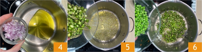 Verhit in een pan de extra vierge olijfolie en voeg de fijngehakte sjalot toe 4. Laat deze op laag vuur 2-3 minuten zacht worden, regelmatig roeren om te voorkomen dat hij verkleurt. Voeg de gesneden asperges 5 en de doperwten 6 toe en laat ze ongeveer 5-6 minuten meebakken, af en toe roeren.