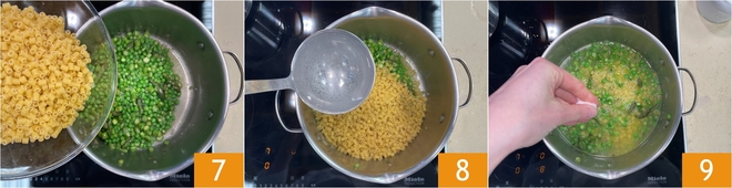 Doe nu de tubetti direct in de pan 7 en voeg meteen een soeplepel warm water toe 8. Ga verder met de bereiding alsof het een risotto is: roer vaak en voeg beetje bij beetje warm water toe zodra het wordt opgenomen, totdat de pasta gaar is. Breng tijdens het koken op smaak met zout 9.
