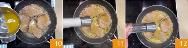 Bak de plakjes ook aan de andere kant 1-2 minuten en giet dan het sinaasappelsap erbij 10. Breng op smaak met zout 11 en peper 12.