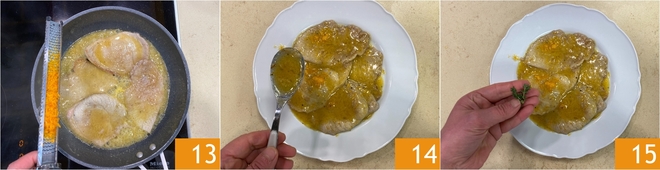 Voeg het grootste deel van de geraspte sinaasappelschil toe 13; roer goed zodat de aanbaksels oplossen en keer de plakjes een paar keer om zodat ze de smaak opnemen. Zet het vuur laag en laat nog enkele minuten sudderen, totdat het bakvocht indikt en romig wordt; in totaal duurt dit ongeveer 8 minuten. Schep de scaloppine vervolgens op een serveerschaal, voeg het sausje toe 14 en enkele takjes tijm 15.