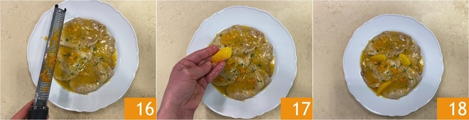 Werk af met wat van de achtergehouden sinaasappelschil 16, de partjes à vif 17 en serveer de scaloppine met sinaasappel goed heet 18!