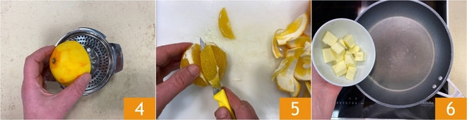 Pers een van de sinaasappels 4: je moet ongeveer 80 g sap krijgen. Schil de overige sinaasappel "à vif" en haal de partjes los met een scherp mesje 5. Doe de boter in een ruime koekenpan 6 en laat die op laag vuur smelten.
