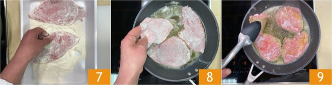 Bestuif ondertussen de plakjes vlees één voor één met bloem en schud het overtollige eraf 7. Als de boter helemaal gesmolten is, zet het vuur iets hoger en leg de plakjes in de pan 8. Laat ze 1-2 minuten aanbakken, draai ze dan om 9.