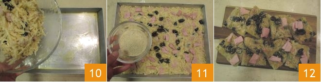 Vet de bodem van een bakvorm van 35x28 cm in en verdeel het mengsel gelijkmatig erin 10. Strooi het paneermeel over het oppervlak 11 en bak in een voorverwarmde oven op 200°C (boven- en onderwarmte) gedurende 20 minuten, op het middelste rek. Na 20 minuten, zet de grill aan en bak nog 3 minuten. Je schiacciata met aardappelen, olijven en tonijn is klaar om te worden gegeten 12!