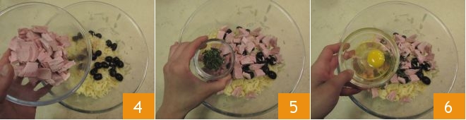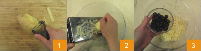 Om de schiacciata met aardappelen, olijven en tonijn te bereiden, schil je eerst de aardappelen 1 en rasp je ze met een grove rasp in een grote kom 2. Voeg de ontpitte olijven toe aan de geraspte aardappelen 3,