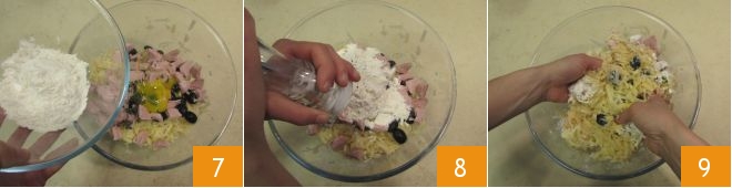 de bloem 7, zout 8 en peper, meng alles goed door zodat het goed gebonden is 9.