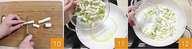 Snijd de sponsali grof 10 en laat ze zachtjes stoven in een anti-aanbakpan met een scheutje olie op laag vuur 11. De sponsali moeten langzaam garen: voeg een beetje water toe 12 en laat ze ongeveer 15 minuten zacht worden. Ze moeten wit blijven en niet te veel kleur krijgen (anders worden ze moeilijker te verteren), maar ze moeten wel zacht zijn.