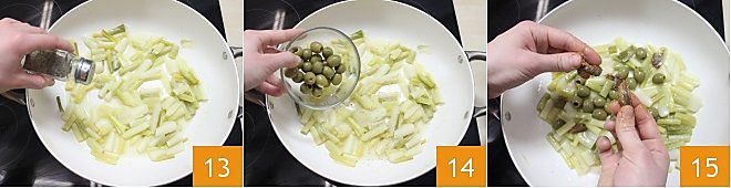 Breng aan het einde van de garing licht op smaak met zout en royaal met zwarte peper 13, en voeg daarna de ontpitte olijven (heel of in stukjes) en de ansjovis toe, met de handen in stukken breken 15. Als er veel vocht in de pan zit, laat de sponsali nog een paar minuten uitdampen. Roer met een lepel, zet het vuur uit en laat de vulling lauwwarm worden.