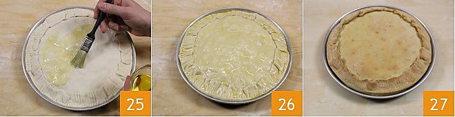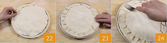 Sluit vervolgens de calzone door de rand rondom om te vouwen (22-23) en verzegel de randen door met de tanden van een vork in te drukken 24.