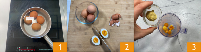 Om de Japanse mayonaise te maken, leg 4 eieren in een pan met koud water. Zodra het water kookt, tel je 10 minuten 1. Koel ze af in koud water, pel ze daarna 2 en doe in de mixerkom alleen de dooiers en de mosterd 3. Gebruik de eiwitten voor andere recepten.