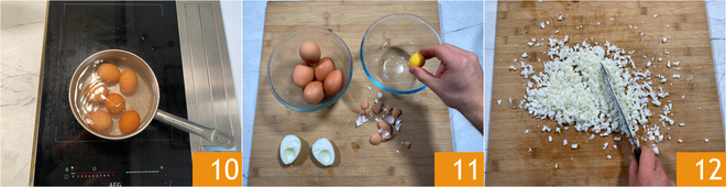 Ga verder met de bereiding van het tamago sandwich. Leg 6 eieren in een pan met koud water, breng aan de kook en tel 10 minuten 10. Koel de eieren af in koud water en pel ze daarna, waarbij je dooiers en eiwitten van elkaar scheidt 11. Hak de eiwitten vervolgens grof met een mes 12.