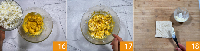 Prak de dooiers in een kom 13 en voeg 100 gram Japanse mayonaise toe 14, zout en peper 15; meng goed.