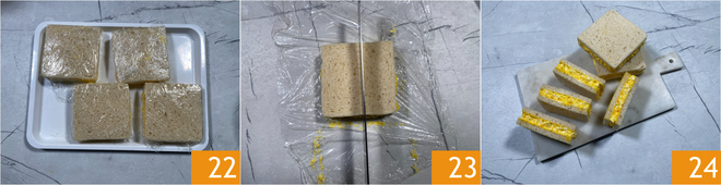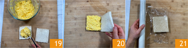 Beleg ze vervolgens royaal met het eimengsel 19 en sluit door ze te combineren met een ander beboterd sneetje 20. Wikkel het sandwich in huishoudfolie 21.