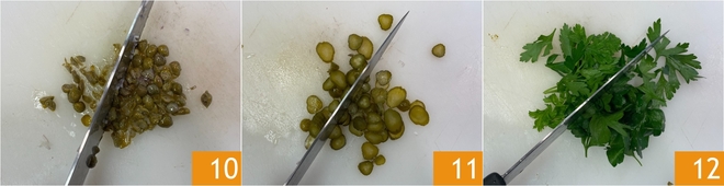 Hak ook de ontzoute kappertjes 10, de augurkjes 11 en de peterselie 12.
