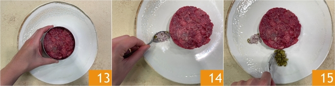 Je bent klaar om op te maken: gebruik een ronde uitsteekring om het vlees de vorm van een medaillon te geven 13, maak het gerecht vervolgens af met de smaakmakers en vorm quenelles met behulp van 2 theelepels. Voeg daarna de sjalot 14 en de augurkjes 15 toe.