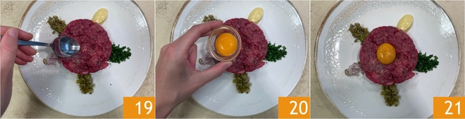 Maak tenslotte met de punt van een theelepel een holte in het oppervlak van de tartaar 19 en laat voorzichtig een eidooier in het midden glijden 20. Je rundertartaar is klaar om opgediend te worden 21!