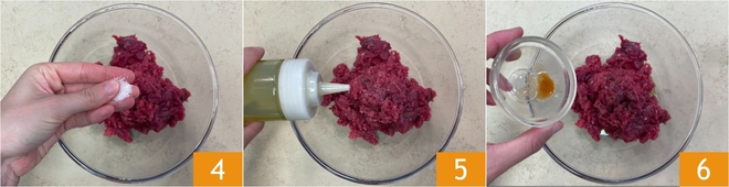 Doe het vlees in een kom en breng op smaak met zout 4, peper, olie 5 en tabasco 6.