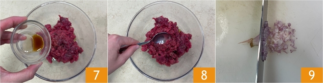 Voeg de Worcestersaus 7 toe en meng 8. Snijd en hak nu de sjalot 9.