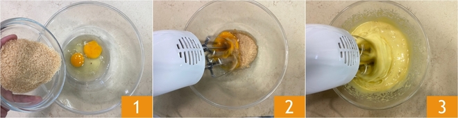 Om de tiramisù met Griekse yoghurt te bereiden, begin je met de pasta biscotto: doe de suiker en de eieren in een kom 1, en klop met de elektrische garde ongeveer tien minuten 2 of totdat het mengsel licht en schuimig is 3.