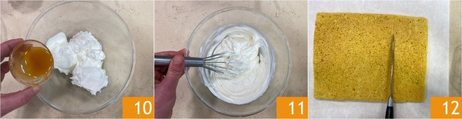 Maak ondertussen de yoghurtcr e8me: doe de Griekse yoghurt en de honing in een kom 10 en meng goed met een garde 11. Neem de pasta biscotto en snijd deze in rechthoeken van dezelfde afmeting als de ovenschaal waarin je de tiramisù gaat opbouwen (onze maat 22x17 cm) 12.
