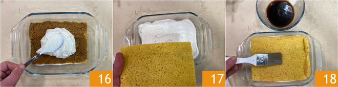 Smeer er ongeveer de helft van de Griekse yoghurtcr e8me overheen 16 en ga verder met een tweede laag pasta biscotto 17 die je weer met koffie besprenkelt 18.