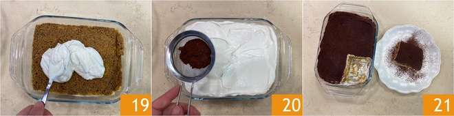 Maak af met de resterende Griekse yoghurtcr e8me 19, strijk glad en bestrooi met gezeefde ongezoete cacaopoeder 20. Laat je tiramis f9 met Griekse yoghurt minstens 2 uur in de koelkast rusten voordat je hem serveert 21!