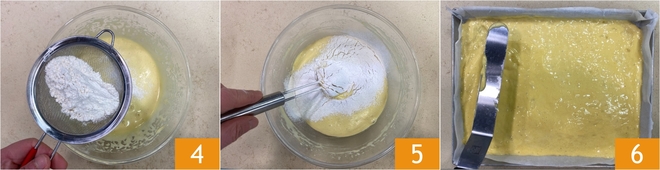Zeef de bloem 4 en het bakpoeder, en meng vervolgens voorzichtig de droge bestanddelen met een spatel 5. Schep het beslag in een bakplaat van 35x28 cm bekleed met bakpapier en strijk het gelijkmatig uit 6.
