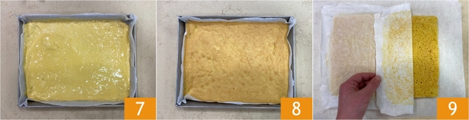 Bak de pasta biscotto in een voorverwarmde oven zonder hetelucht op 180 C gedurende ongeveer 15 minuten 7. Wanneer hij gaar is 8, keer je hem om op een vel bakpapier en laat je volledig afkoelen. Als hij afgekoeld is, verwijder je voorzichtig het bovenste vel bakpapier 9.
