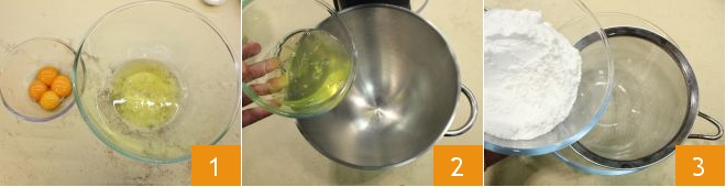 Om de driekleurige meringues te bereiden, begin je met het maken van de Franse meringue. Begin met het scheiden van de dooiers van de eiwitten en giet ze vervolgens in een keukenmachine of in een hoge kom 1. Doe het eiwit in een keukenmachine met garde of in een hoge kom 2 en begin op middelhoog tempo te kloppen. Zeef ondertussen de poedersuiker in een aparte kom 3.