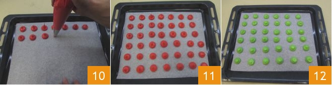 Neem nu een bakplaat en bekleed deze met bakpapier. Vul de gekleurde meringuemengsels in twee verschillende spuitzakken met een gladde spuitmond; spuit met de ene kleine meringue-druppeltjes van 2 à 3 cm diameter 10 en houd ze uit elkaar. Je zou ongeveer 30 kleine meringues moeten krijgen. Herhaal dit ook met de andere spuitzak. Bak in een voorverwarmde oven (conventioneel) op 90°C gedurende minstens 3 uur, zorg ervoor dat de ovendeur iets open blijft zodat zoveel mogelijk vocht kan ontsnappen. Als ze droog zijn 12, haal je ze uit de oven en laat je ze afkoelen.