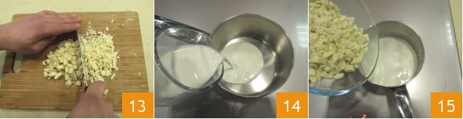 Ga ondertussen verder met de bereiding van de witte chocoladecrème. Hak de witte chocolade op een snijplank fijn 13. Doe vervolgens de room in een steelpan en breng aan de kook 14. Zodra het kookpunt is bereikt, haal je de pan van het vuur en voeg je de gehakte chocolade toe 15, blijf roeren met een spatel zodat de chocolade smelt en er geen klontjes ontstaan. Schep de crème in een kommetje. Bedek deze met huishoudfolie direct op het oppervlak om te voorkomen dat er een vel ontstaat en laat afkoelen tot kamertemperatuur. Als het kamertemperatuur heeft bereikt, zet je de crème minstens 1 uur in de koelkast.