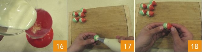 Vul de witte chocoladecrème vervolgens in een spuitzak 16. Neem een groene meringue en vul de platte kant met wat crème 17 en leg er een rode meringue op 18. Herhaal dit voor alle 30 meringues en geniet van een heerlijke Bevrijdingsdag!