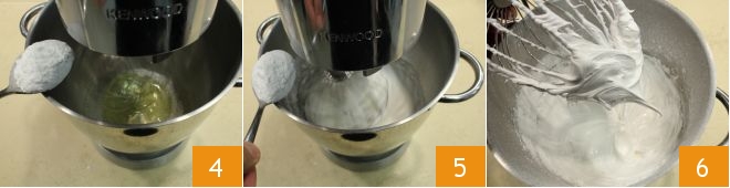 Voeg 110 g poedersuiker toe, beetje bij beetje, en blijf kloppen met de garde 4. Wanneer het eiwit stijf en luchtig is, ga je verder met het toevoegen van de resterende poedersuiker, steeds één eetlepel tegelijk 5, waarbij je erop let pas een volgende eetlepel toe te voegen als de vorige volledig is opgenomen, totdat je een witte en schuimige meringue krijgt 6.
