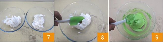 Verdeel het verkregen beslag vervolgens gelijkmatig over twee aparte kommetjes 7. Doe in de ene 1 g groene kleurstof 8: meng goed met een spatel zodat de kleur egaal wordt 9. Herhaal de handeling met de rode kleurstof.