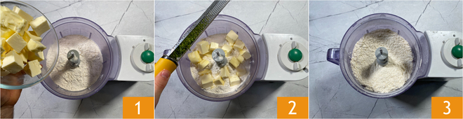 Om de tropische taart te maken, begin je met de zanddeeg: in een mixer met mes voeg je de bloem toe samen met de koude boter in blokjes 1 en de geraspte limoenschil 2, daarna maal je tot je een zandachtig mengsel krijgt 3.