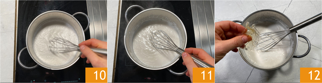 Zet op het vuur en laat ongeveer 10 minuten koken, voortdurend roerend 10; als het begint te koken, haal van het vuur. Wanneer de crème wat dikker is geworden 11, zet je het vuur uit en voeg je de gelatine toe 12.