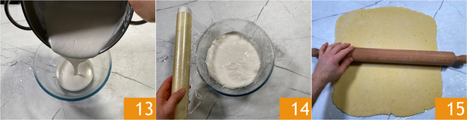 Schep de crème in een kom 13, dek af met vershoudfolie direct op het oppervlak en laat minstens een uur afkoelen in de koelkast 14. Nadat de rusttijd van het deeg verstreken is, rol je het uit tot 0,5 cm dik op een licht bebloemd werkblad 15.