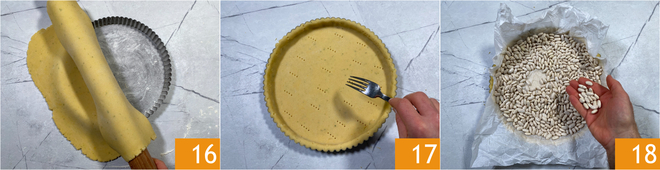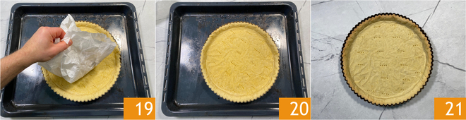 Leg het deeg in een ingevette en bebloemde taartvorm met losse bodem van 27 cm diameter 16 en prik gaatjes in de bodem met een vork 17. Bedek met een vel bakpapier, voeg droge peulvruchten toe (of speciale keramische bakparels) en Hoe blind bakken op 170 voor 20 minuten 18.