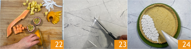 Ga aan de slag met de decoratie: maak het fruit schoon en snijd vervolgens: de ananas in driehoekjes, de papaja in blokjes, de kokos in dunne plakjes met een dunschiller en de mango in reepjes 22. Knip de punt van een spuitzak schuin af 23 en vul hem met de koude kokoscrème. Vul vervolgens de bodem van de taart met de crème en vorm een decoratief motief 24.