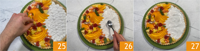 Verdeel de stukjes fruit over de bovenkant inclusief de frambozen en wat verse muntblaadjes 25, en beweeg daarna voorzichtig de crème met de bolle kant van een theelepel voor wat reliëf 26. Jullie tropische taart is klaar om geserveerd te worden 27!