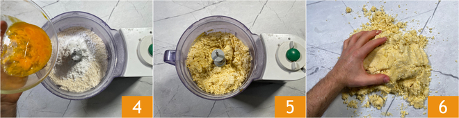 Voeg de poedersuiker en de eieren toe 4 en laat de mixer nog even draaien 5. Schep het mengsel op het werkblad en kneed snel met de hand 6, net genoeg om een stevig bolletje te vormen. Wikkel het in vershoudfolie en laat het minstens een uur opstijven in de koelkast.