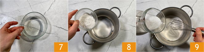 Ga verder met de kokoscrème: week de gelatine in koud water 7. Meng de rijstmeel en de suiker in een steelpan 8, giet vervolgens de kokosmelk erbij terwijl je met een garde roert om klontjes te voorkomen 9.
