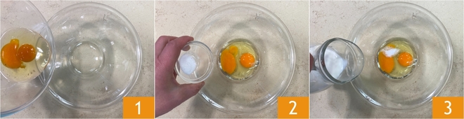 Om de valdostaanse crêpes te maken, begin je met het beslag: laat de boter in een klein pannetje smelten en laat hem iets afkoelen. Doe ondertussen in een kom de eieren 1, het zout 2 en de melk 3.