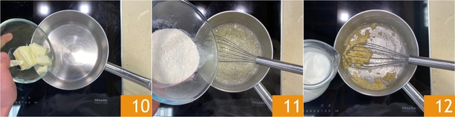 Neem nu de béchamel: verwarm de melk in een pannetje en smelt in een ander pannetje de boter 10. Zodra de boter gesmolten is, strooi je er de bloem bij 11 en roer je krachtig met een garde tot je een roux krijgt. Voeg vervolgens beetje bij beetje wat hete melk toe 12.