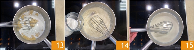 Maak je geen zorgen als er klontjes ontstaan, het volstaat om met de garde tot tegen de randen van de pan te blijven roeren 13. Voeg daarna de resterende melk toe 14 en blijf de béchamel op laag vuur koken tot je een dikke, gladde en zijdeachtige saus hebt 15.