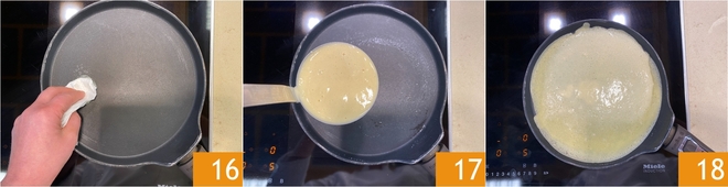 Na de rusttijd van het beslag ga je de crêpes bakken: verwarm een crêpepan of een antiaanbakpan met een diameter van 18 cm en bestrijk deze met een dun laagje boter 16. Giet een pollepel beslag in het midden van de pan 17 en kantel de pan om het beslag over de hele bodem te verdelen. Bak op middellaag-laag vuur totdat de randen van de crêpe los beginnen te komen 18, draai hem dan om en bak de andere kant nog ongeveer een minuut. Met deze hoeveelheden krijg je ongeveer 8 crêpes.
