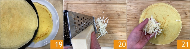 Stap de crêpes op een bord terwijl ze klaar zijn 19. Je kunt nu beginnen met vullen: rasp de fontina met een grove rasp 20 en verdeel deze over de bovenkant van de eerste crêpe 21.