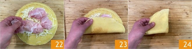 Leg ook de gekookte ham in plakjes erop 22 en vouw de crêpe eerst dubbel 23 en daarna nogmaals dubbel 24, zodat er een driehoek ontstaat. Herhaal zo met alle crêpes.