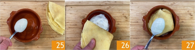 Neem nu portieschaaltjes en bedek de bodem met béchamel 25, leg er een gevulde crêpe in 26 en dek deze af met nog wat béchamel 26.
