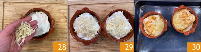 Leg er een tweede gevulde crêpe op, bedek die weer met wat béchamel en bestrooi de bovenkant met geraspte fontina 28. Zet op deze manier al je schaaltjes klaar. Bak in een gewone oven op 200C gedurende 10 minuten, zet daarna de grill aan en gratineer nog 5 minuten op 240C 29. Als ze mooi goudbruin zijn, haal je de valdostaanse crêpes uit de oven, maal er wat peper over en serveer ze direct heet 30!
